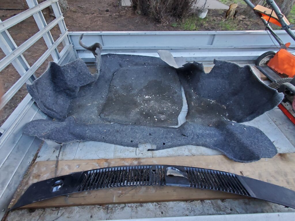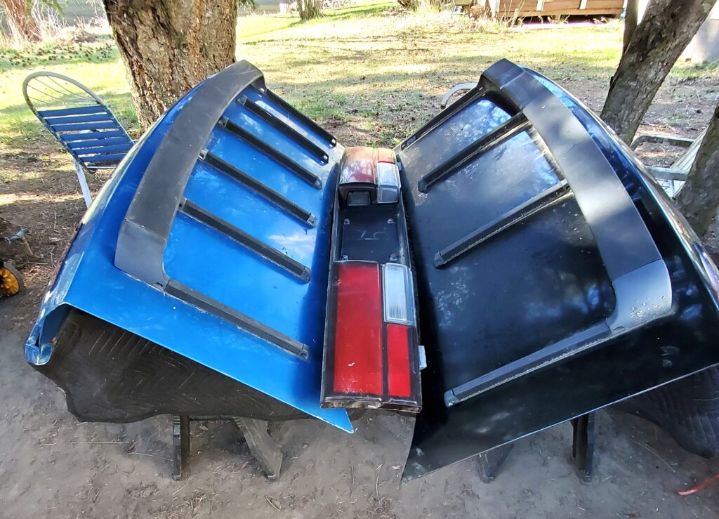 First thing on the agenda. And because need to still drive the car. The plan will be to work with what I have that’s not currently on the car..For now it’s.. The trunk lids. Today I gave them a bath so I could look them over carefully, decisions need to be made. The blue one is the original trunk lid, and was changed out most likely because it has a welded up place where the latch mounts. Kinda messy too. But it has the six luggage rails that are proper for the year. Also the centre brake light is dented down.. Again I see why it was changed. The black lid has the proper latch mount. But only has holes for four luggage rails. New holes are easy to do. Welding up four old holes is easy too. Also I would want to paint both sides, inside and outer. I’m leaning toward the black one.. Because to repair the blue lid I would have to weld the latch mount from the black lid into the blue one.. And that position needs to be accurate ,so not ideal for me.