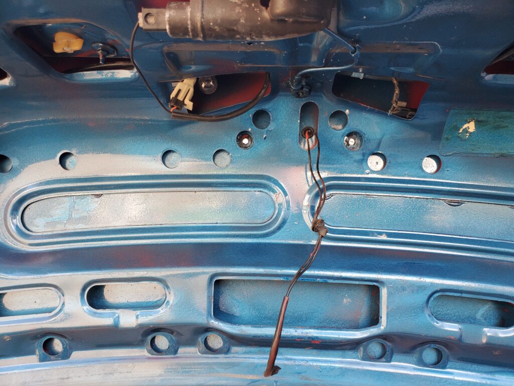 The trunk lid is from an early 90’s car.. The spoiler was bigger and so was the brake light. As you can see the holes do not line up. I was considering using this lid, but I would have to drill twelve new holes and fill these two. Also this lid was red… and some of that shows on the inside.